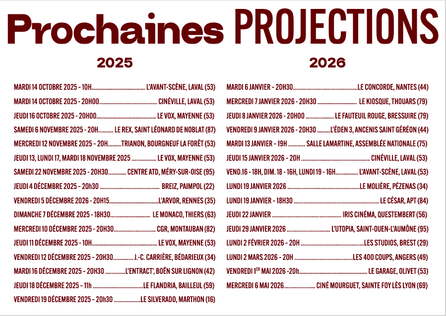 Le film commence à circuler en salles de cinéma un peu partout en France, avec le concours actif de TZCLD, d’ATD Quart Monde, de notre association Autour du 1er Mai et de réseaux de salles comme l’ACOR, Cinéphare, Véo, Ciné 32... L’équipe du film répond dans la mesure du possible aux demandes de présence du réalisateur et/ou du producteur pour animer les séances, aux côtés d’intervenant·es des territoires sur lesquels ont lieu les projections.