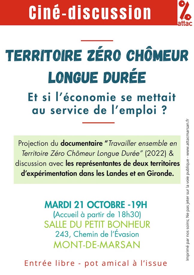 Dans le cadre de son cycle thématique intitulé « Au travail ! Mais quel travail ? », entamé en début d’année, Attac Marsan organise une soirée pour découvrir les « Territoires zéro chômeur de longue durée » (TZCLD), toujours dans l’optique de remettre du sens au travail, à son utilité sociale et dans son organisation.